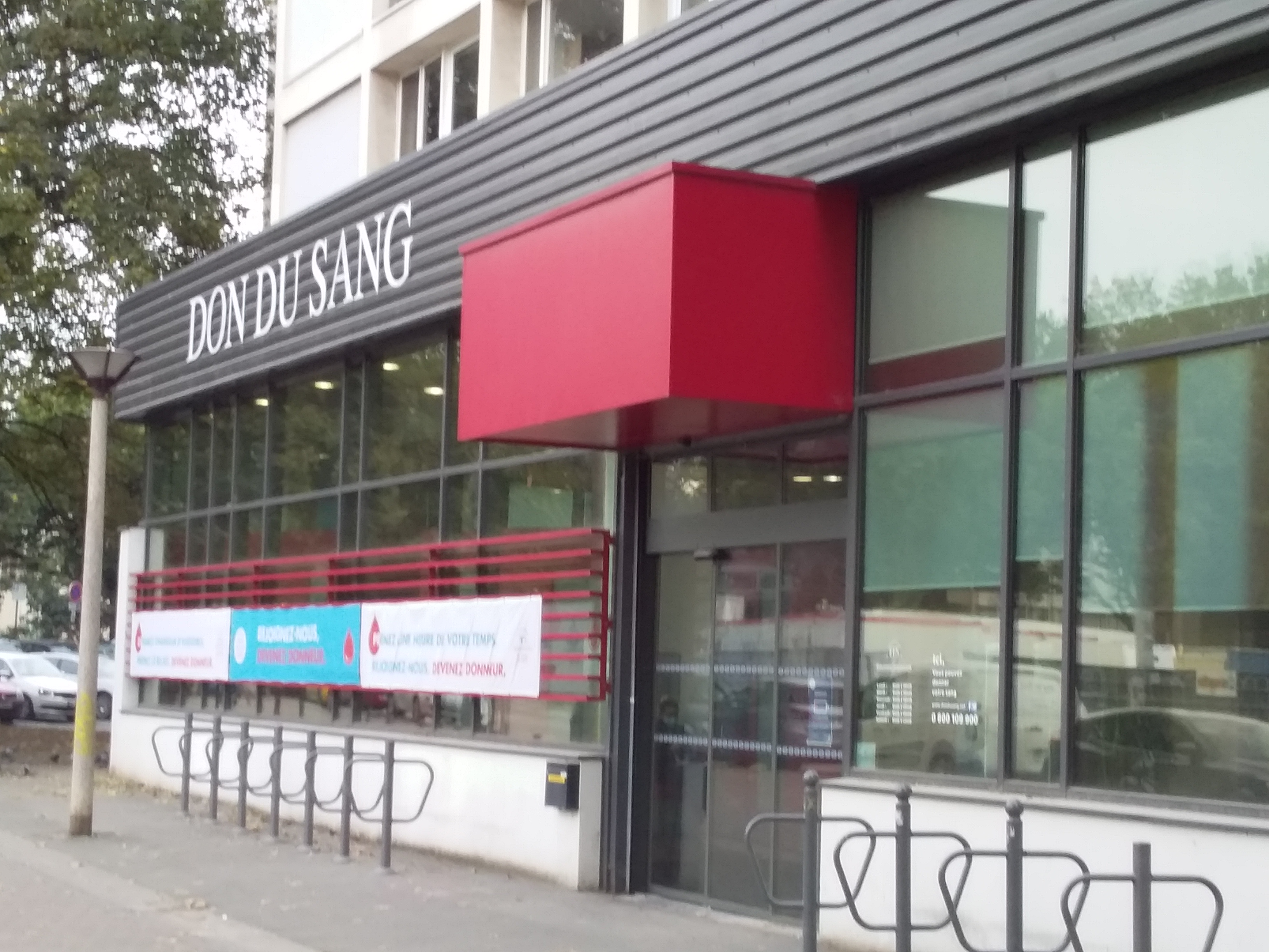 Bâtiment moderne, calme, trop silencieux peut-être, non en vrai c'est cool, ça fait grave du bien. Vous êtes attirés inexorablement par l'accueil où des accueillants vous offrent des papiers à remplir, vous enregistrent, tout sourire, et vous invitent à vous payer la beuverie non alcoolisée de votre life. Puis après on vous emmène voir un gentil médecin qui vous prend une goutte de sang et votre tension, qui vous questionne et tout, sourire en prime pour certains. Puis après, vous êtes piégés sur un fauteuil où un tuyau vous pompe votre âme. Après vous être délesté d'au moins 480 ml de sang, vous êtes invités à aller vous nourrir un peu. Et là, vos p'tites gambettes toutes flageolantes vous emmènent au restaurant, et vous êtes pourris-gâtés de boustifaille. Excellent accueil à chaque fois. C'est devenu un moment plaisir, de donner son sang.