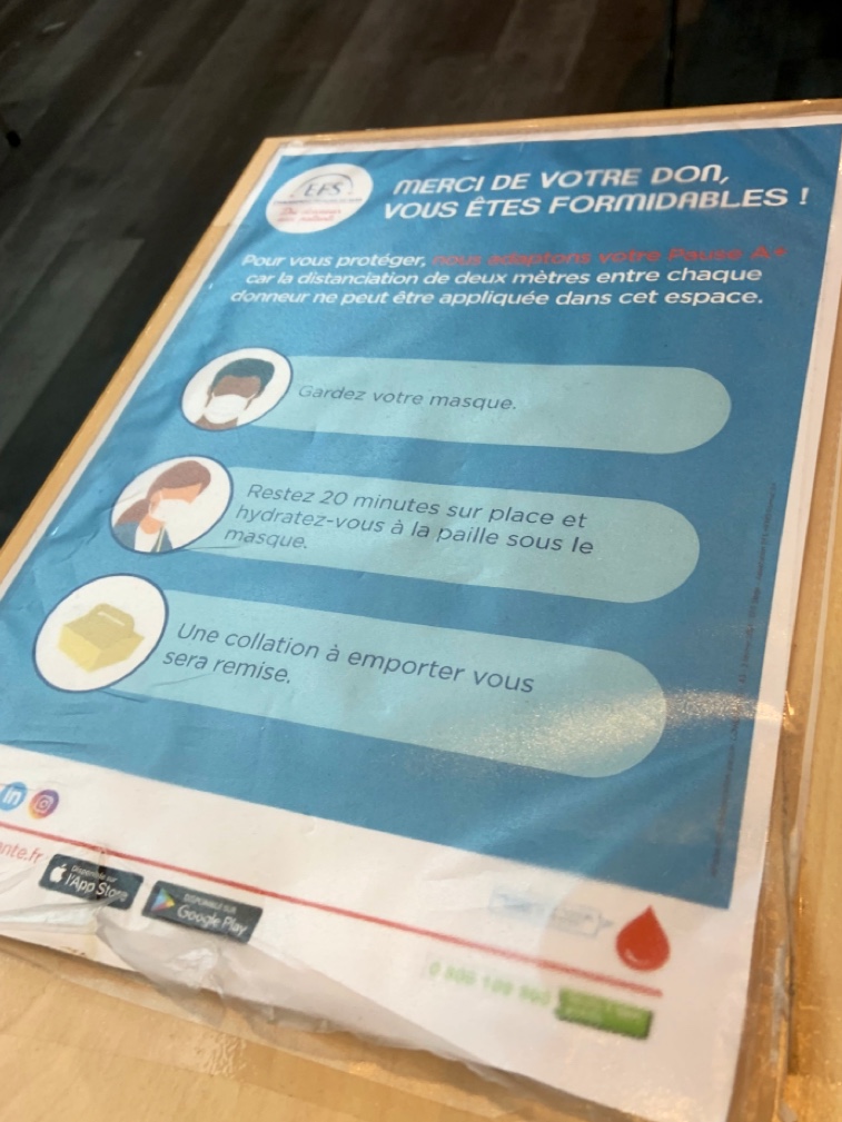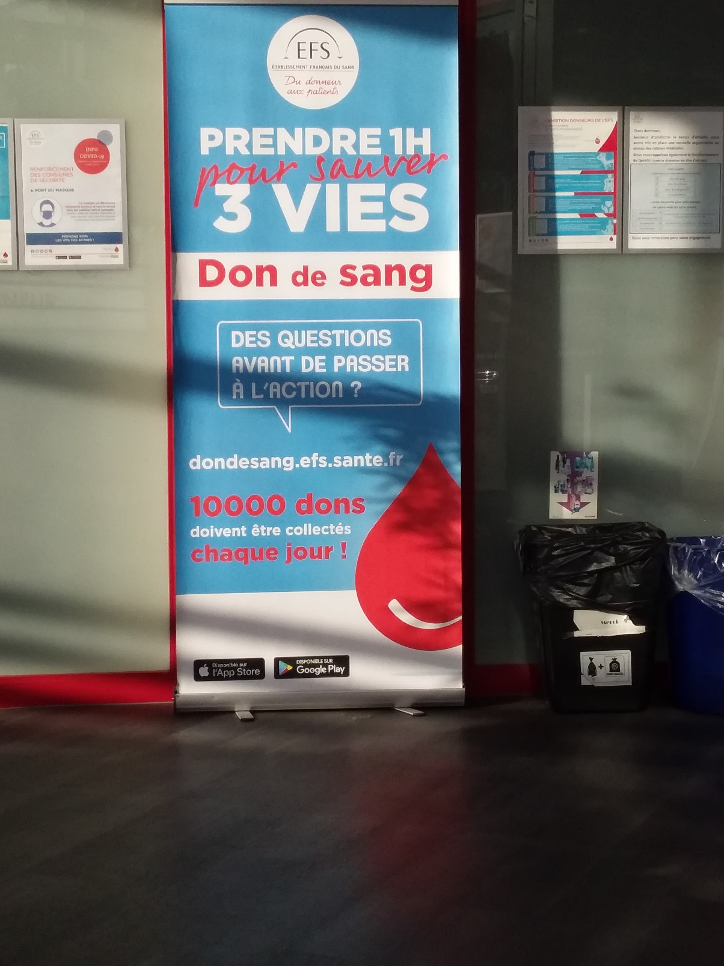 Aïe ! Après 55 dons de sang total je n’y remettrais plus jamais les pieds. (Je venais tous les 2 mois vous pouvez vérifier !) Les mesures covid deviennent complètement disproportionnées : -Avant le don une infirmière m’hurle dessus en disant de s’hydrater en prenant une paille sous le masque, je n’ai JAMAIS vu ça ailleurs, j’ai cru à une blague sur le coup. Je lui dit que je vais m’hydrater plus tard dehors en sortant elle me force à prendre une paille quand même ! -Au moment de la collation post-don, il faut NORMALEMENT se poser 20min pour manger et s’hydrater : impossible ici il faut manger PLUS TARD ET DEHORS et pour l’hydratation c’est encore la paille sous le masque qui est préconisée ! On ressort de là la tête qui tourne à la limite du malaise... Où est le rapport bénéfice-risque si c’est pour faire un malaise après ? Enfin, mettez-vous à la place de celui qui fait son premier don là-bas ? Il ne revient pas ! Pourtant je suis sur-sollicité par l’EFS tous les 2 mois par appel/mail/sms et ils expliquent qu’ils manquent de donneurs...