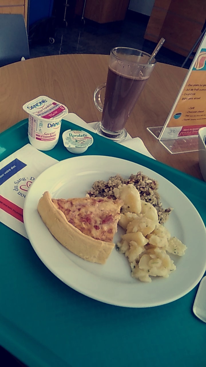 J'ai été avec une amie un samedi matin et ça s'est vraiment très bien passé! C'était notre deuxième don, premier qu'on avait effectué dans notre école et le personnel étaient vraiment top. Du début à la fin nous avons été suivies. Nous étions surprises d'avoir droit à un vrai repas en tant que collation, on n'était pas au courant et ce fût une belle surprise aha.